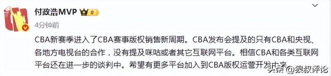 媒体人付政浩发文点评:“CBA新赛季进入了CBA赛事版权销售新周期。CBA发布会提及的只有CBA和央视、各地方电视台的合作,没有提及咪咕或者其它互联网平台。相信CBA和各类互联网平台还在进一步的谈判中。希望有更多平台加入到CBA版权运营开发中来。