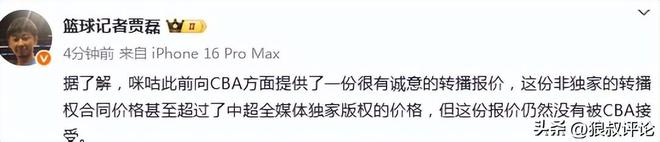 篮球记者贾磊发文点评:“据了解,咪咕此前向CBA方面提供了一份很有诚意的转播报价,这份非独家的转播权合同价格甚至超过了中超全媒体独家版权的价格,但这份报价仍然没有被CBA接受。”