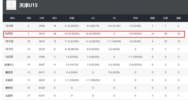 第五场对阵甘肃U15女篮,柏荷雨欣迎来了大爆发,出战38分钟,24投12中,罚球8中4,得到28分34篮板2助攻1盖帽,正负值为+32。