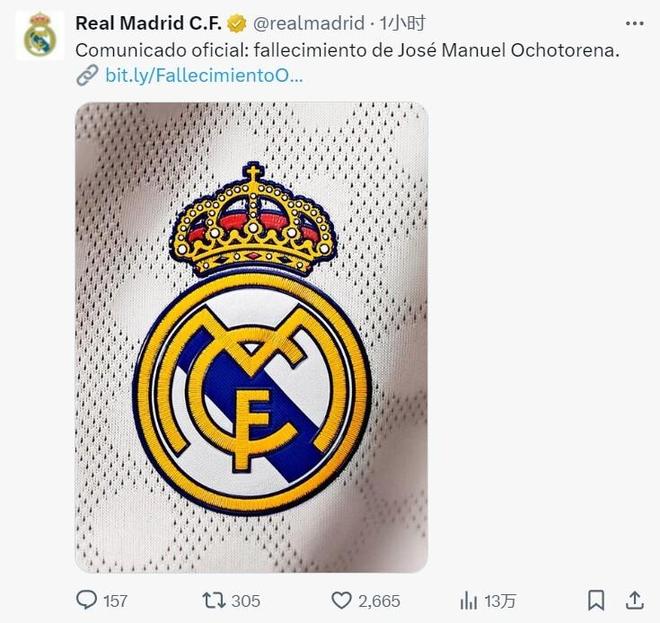 皇马在官方写道:“皇家马德里俱乐部对我们的传奇门将之一何塞-曼努埃尔-奥乔托雷纳的去世深感遗憾。