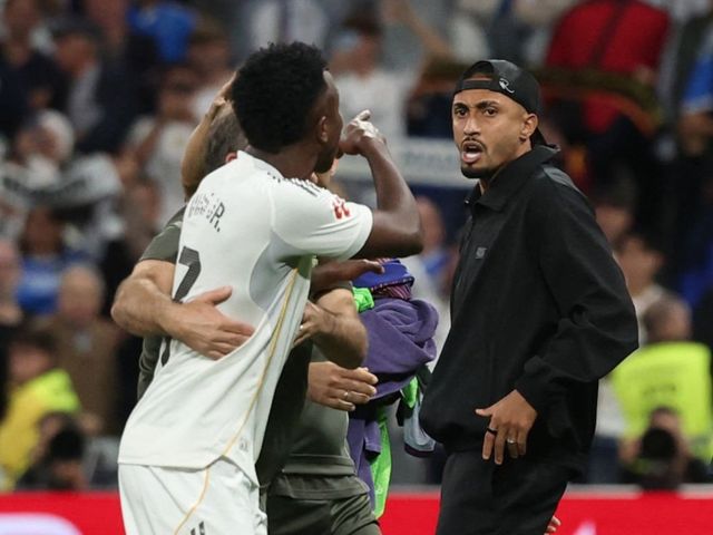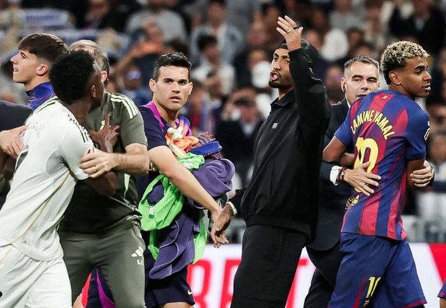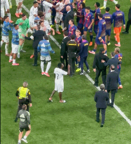 双方的焦点,落到维尼修斯vs亚马尔上。多名皇马工作人员将维尼修斯拦住,拉菲尼亚(反戴鸭舌帽)也迅速冲到第一现场,拦住维尼修斯、亚马尔。